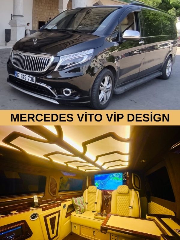 Below you can view our selection of vehicles designed to suit all preferences, budgets and group sizes. The Mercedes Vito Economy Class seats up to 6 passengers, while the VIP Design version seats up to 5. For larger groups, our Sprinter can accommodate up to 15 passengers.